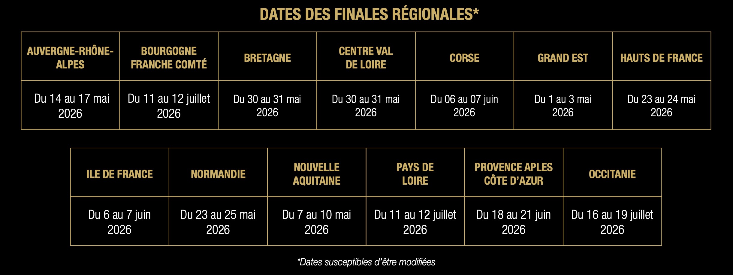 - Les matchs se jouent dans les 93 départements (hors DOM-TOM) entre le 1er février et le 30 avril 2026.